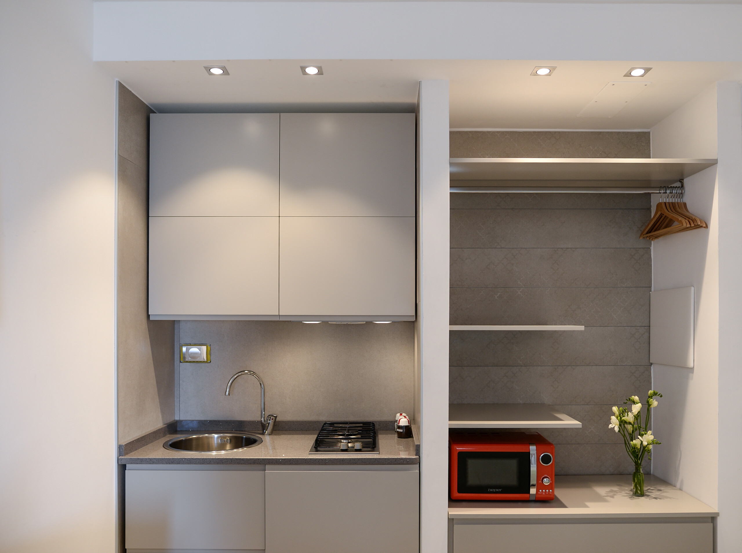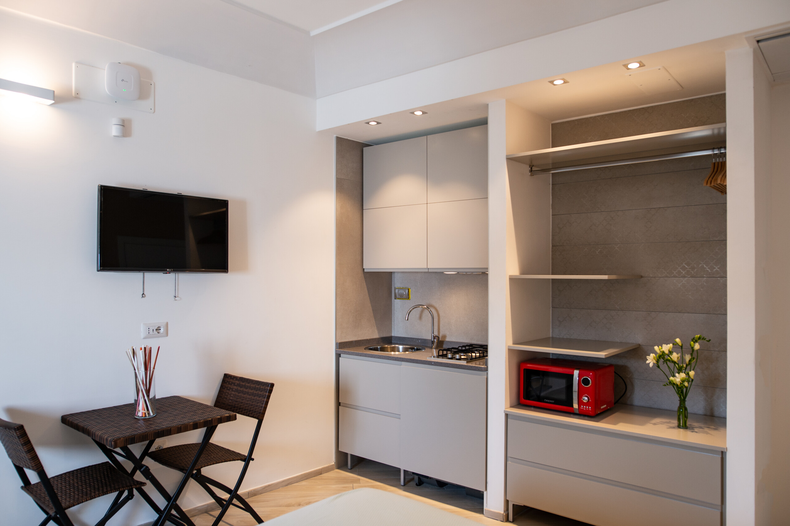 El piso puede alojar hasta 2 personas y consta de una habitación doble con cocina americana, baño y aparcamiento privado gratuito.