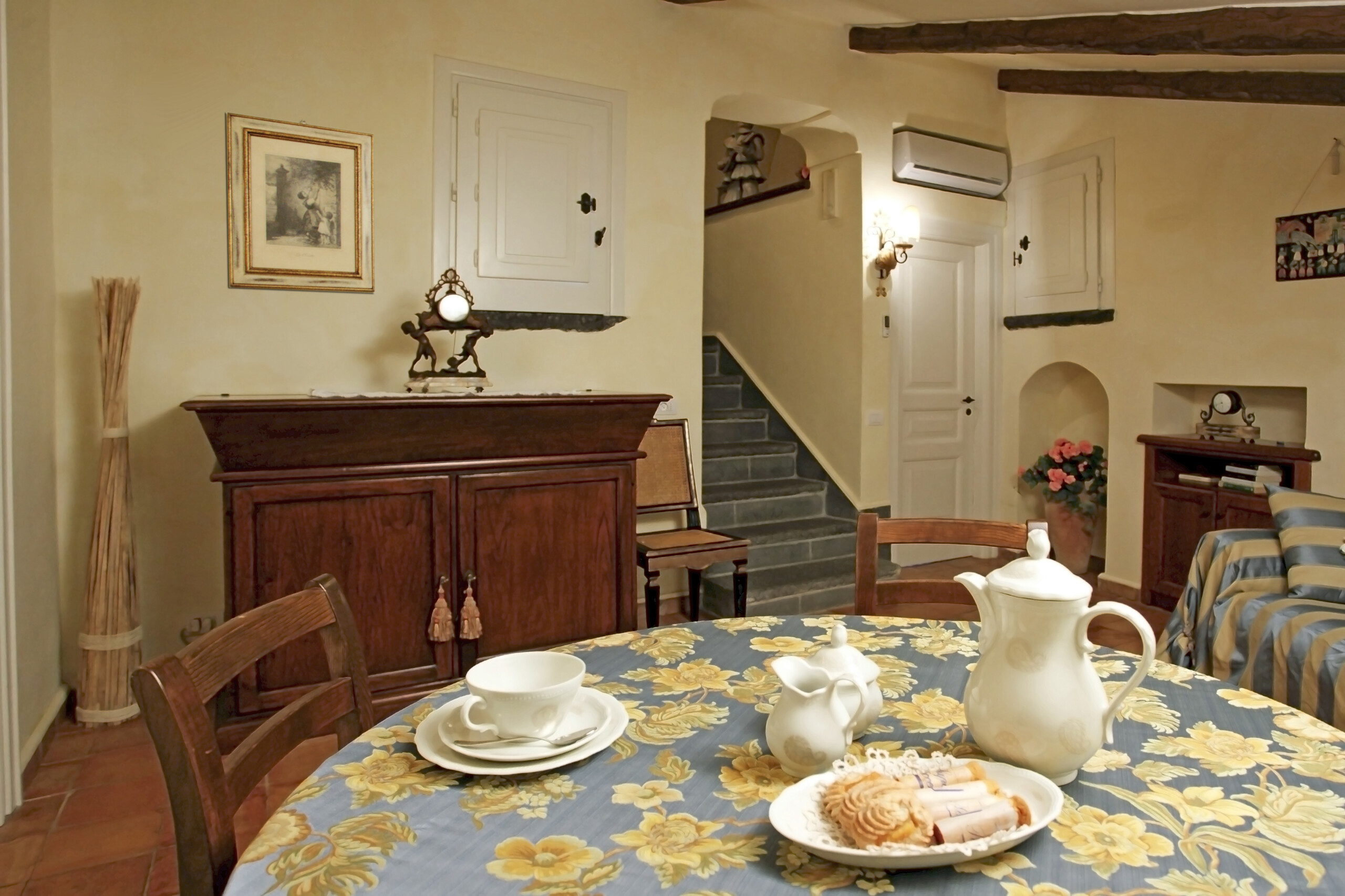 - Consta de un gran comedor con muebles de época, sofá, sillones, una mesa de hierro forjado y una chimenea.