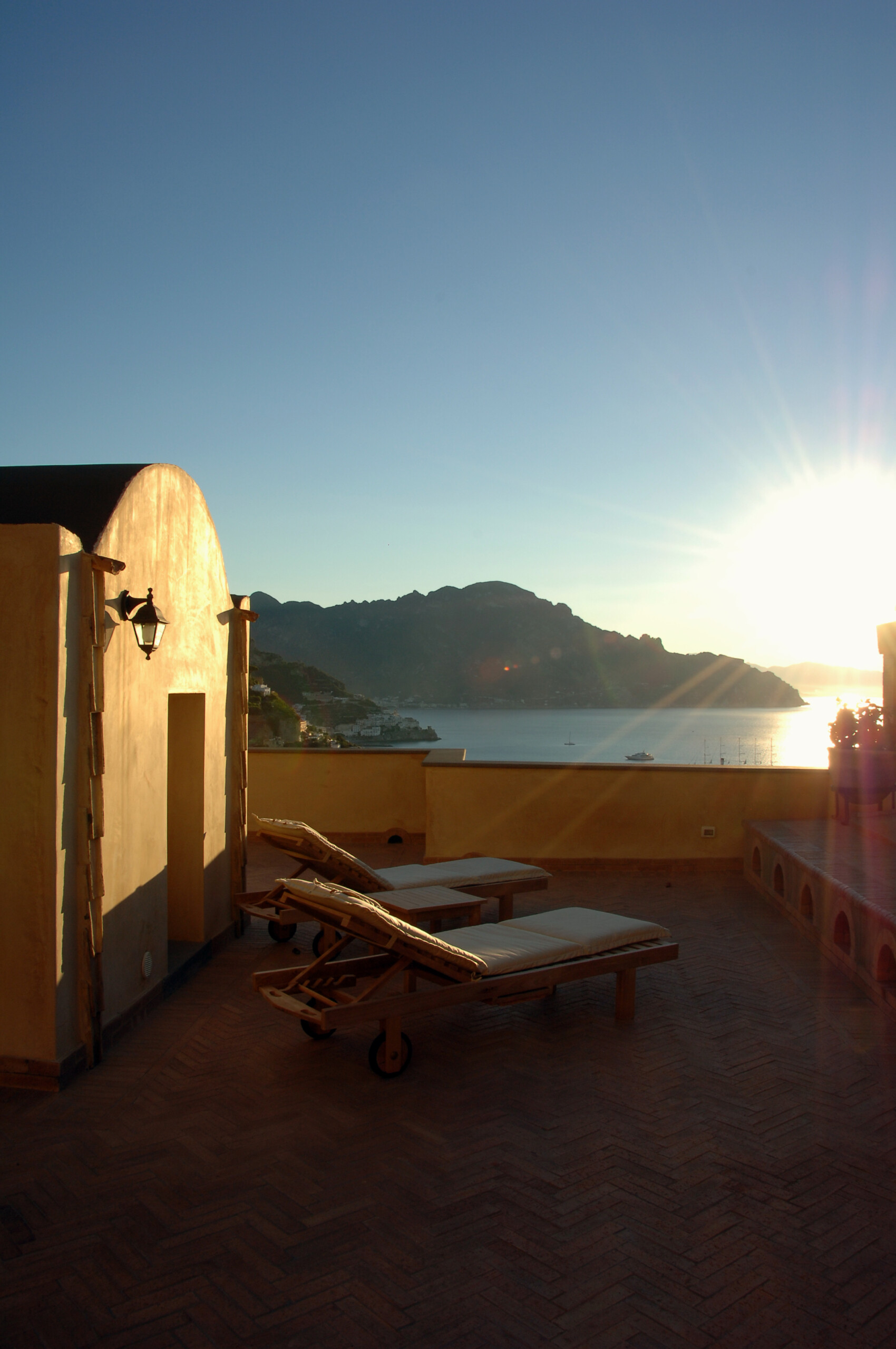 - La “Suite Sunrise” consta de un baño privado con jacuzzi, una gran terraza privada de 40 metros cuadrados con una maravillosa vista a la espléndida Costa de Amalfi. La suite Sunrise consta de una sala de estar con vista al mar, separada del dormitorio para garantizar mayor privacidad y comodidad, pasillo de piedra y baño con jacuzzi. Los muebles son obras únicas de la tradición napolitana, el antiguo suelo cerámico con las mayólicas verdes tipícas de Vietri sul Mare hacen de esta suite la más prestigiosa de la villa. A petición, posibilidad de dos camas adicionales.
