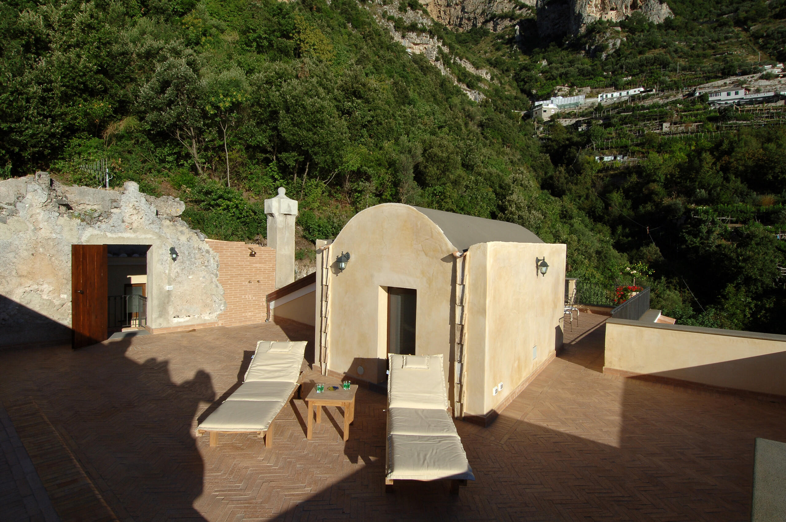 - “The Tower Suite” originalmente era una torre de vigilancia. La suite se encuentra en la parte superior de la villa y consta de una terraza privada con solarium de 100 metros cuadrados con una espléndida vista de 360° de toda la Costa de Amalfi. Esta habitación parece a un ático encantador, con una elegante sala de estar y un baño de mármol del Vesuvio. Consta de un antiguo suelo cerámico, así como un techo con vigas y lámparas de araña muy preciosas. Previa solicitud hay la posibilidad de una cama supletoria.